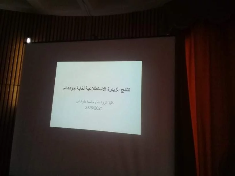 تفضل السيد/ د. رضا الصادق الشريف، أحد أعضاء فريق الخبراء من كلية الزراعة، مشكوراً، بتقديم التقرير العلمي الذي أعده فريق العمل حول الوضع الراهن لغابة جوددائم. ولقد أبدى الحضور الكريم اعجابهم بجودة التقرير، ودقة المعلومات والبيانات التي عرضت فيه، وكذلك حسن الإلقاء. وتم بعد ذلك مناقشة الأسباب التي أدت إلى تدهور حالة الأشجار، والتربة والمياه في غابة جوددائم، وبعض الغابات الأخرى في أنحاء متفرقة من ليبيا، والتأكيد على ضرورة وضع الحلول العاجلة للتصدي لهذه المسببات، وذلك من خلال استمرار العمل المنسق بين كلية الزراعة، والحركة الكشفية.