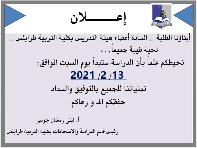 أبناؤنا الطلبة  بكلية التربية _ طرابلس .. نحيطكم علماً بأن الدراسة ستبدأ يوم السبت الموافق 13|2|2021 ومن خلال ما تم مناقشته في الاجتماع الطارئ الذي عقد اليوم الخميس الموافق:11/ 2/ 2021 للسيد عميد الكلية الدكتور عمر عامر والسيد وكيل الكلية الدكتور عبدالسلام الاطرش والس