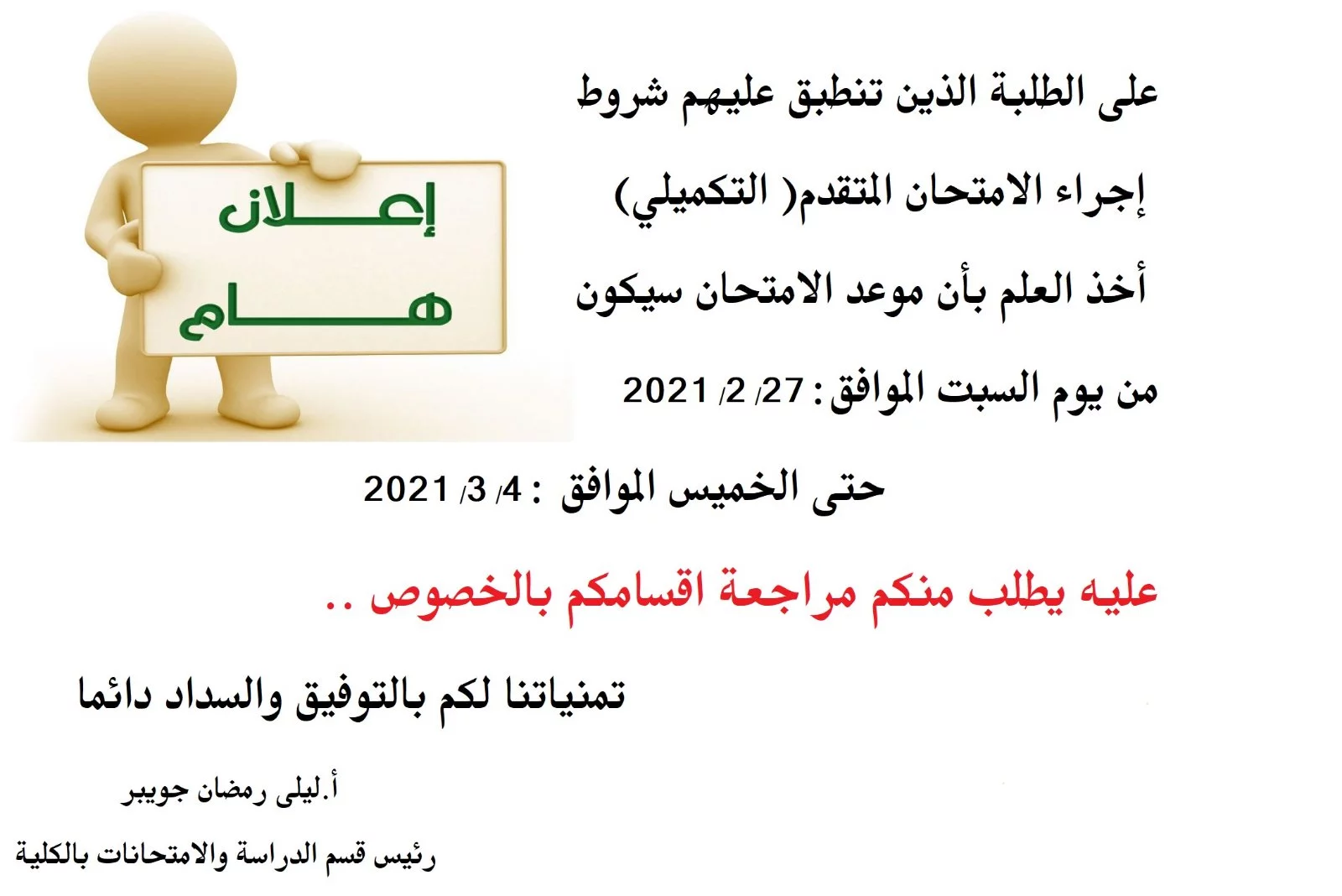 موعد الامتحان التكميلي "المتقدم" لطلبة كلية التربية طرابلس