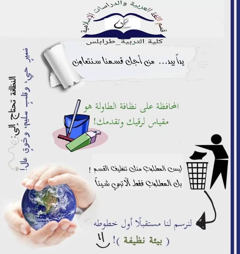 ضمن سلسلة النشاطات الثقافية بقسم اللغة العربية والدراسات الإسلامية، بكلية التربية طرابلسنظم قسم اللغة العربية والدراسات الإسلامية بكلية التربية طرابلس يوم الأحد 29 ديسمبر 2019م، حملة تطوعية لتنظيف أروقة القسم، تحت شعار
