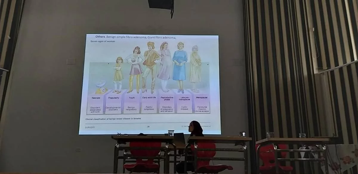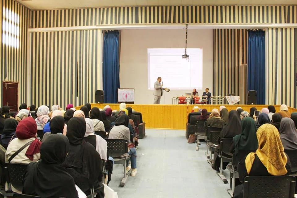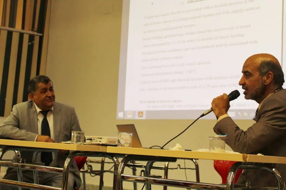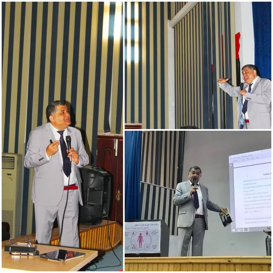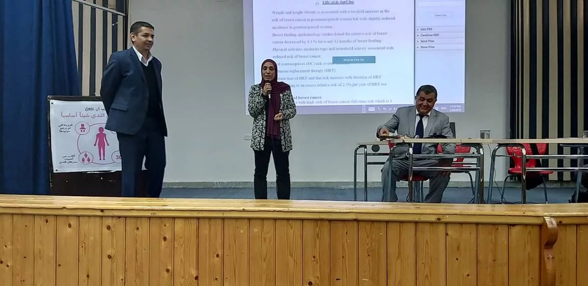 استضاف قسم الأحياء اليوم بالتعاون مع مكتب المعلومات والتوثيق بالكلية السيد الدكتور علي عبد الرحمان سيالة أخصائي الجراحة العامة وجراحة أورام الثدي والمهتم بالطب الحديث الذي شرفنا بحضوره وألقى على مسامعنا محاضرة توعوية تثقيفية حول صحة الثدي والأمراض التي قد تصاب بها النساء لعوامل معينة أسردها تفصيلآ وألقى الضوء خلال المحاضرة على مرض سرطان الثدي (Breast Cancer) حيث أوضح الدكتور أنه مرض يصيب النساء بالتحديد، لكنه قد يصيب الرجال أيضا، وإن كان بنسبة أقل بكثير، وشرح الأسباب والأعراض الناتجة عن الإصابة، وكيفية الكشف المبكر عنه، وطرق الوقاية وقدم نصائحه بالقيام بالفحص الذاتي للثدي وعدّد طرق الفحص، حيث أشار إلى أنه يجب أن يكون جزءًا من العناية الروتينية كل شهر وذلك بعد الدورة الشهرية بعشرة أيام، وأوجب زيارة الطبيب عند ملاحظة أية تغيرات ونوّه أن هذا الأمر قد يساعد ويساهم بشكل فعاّل في الكشف المبكر عن الإصابة بمرض سرطان الثدي.وأشار الدكتور إلى أن الأطباء في العديد من المستشفيات والمراكز الصحية والعلمية توصلوا مؤخراً إلى إنجازات كبيرة في مجاليّ الكشف المبكر والعلاج لمرض سرطان الثدي لينخفض عدد الوفيات الناجمة عن المرض...