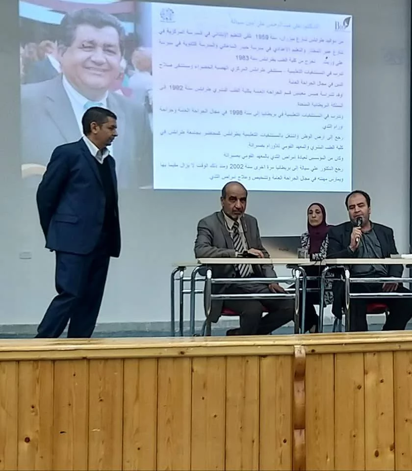 وقد أغدق على الحضور بكَم وفير من المعلومات القيّمة نِتاج خبرته وتعامله مع الكثير من الحالات المرضية، وأنار بصيرتهم بعلمه وخبرته حول هذا المرض وقد تفاعل معه الحاضرون بحسن الاستماع ومشاركته من خلال الملاحظات الذي وجهها إليهم خلال المحاضرة. كما كان هناك إقبال من الطالبات للاستماع والاستفادة من هذه المحاضرة من طالبات القسم ومن الكلية وأيضآ الطاقم التدريسي بقسم الأحياء ومن قسم الحاسوب الأستاذة أماني التي شرفتنا بحضورها لمشاركتنا الاستفادة، والدكتور محمد عسكر الذي ألقى كلمة في بداية هذا الملتقى مُرحِبآ بزميله وصديقه الدكتور علي سيالة، ومدير مكتب المعلومات والتوثيق أ. أسامة القديري الذي ساعدنا بشكل كبير في الإعداد والتحضير لهذه المحاضرة، وقد وجهنا الدعوة عامة للجميع داخل وخارج الكلية، وفي نهاية المحاضرة شكر الدكتور علي سيالة كافة الحضور على حسن استماعهم وعلى تجاوبهم الكبير معه، وقد وعد بتكرار الزيارة في المستقبل، لمناقشة العديد من المواضيع في عدة مجالات ...