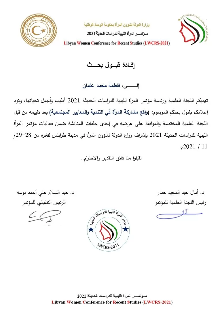 انطلقت صباح يوم الثلاثاء بطرابلس، فعاليات مؤتمر المرأة الليبية للدراسات الحديثة 2021، برعاية حكومة الوحدة الوطنية، واشراف وزارة الدولة لشؤون المرأة، وحضور وزيرة الدولة”حورية الطرمال”، أعضاء هيئات التدريس في الجامعات والمعاهد العليا، البحاث وطُلاب الدراسات العليا، عدد من ممثلي منظمات وهيئات المجتمع المدني، المهتمين بشؤون المرأة، صُناع القرار.يهدف المؤتمر بالعمل على حث كل المؤسسات لتعزيز مشاركة المرأة فيها، أيضاً إبراز دور البحث العلمي وأهميته لتمكين المرأة، والدفع لبناء استراتيجية وطنية لها، ووضع خطط علمية لمواجهة قضاياها.تضمنت أجندة المؤتمر مجموعة محاور حول (المرأة في القانون الليبي، المرأة الليبيةوالاقتصاد، المرأة والأزمات والكوارث، المرأة والإعلام، المرأة والعمل الخيري، المؤسسات وحقوق المرأة، المرأة والطب، المرأة ذوي الاحتياجات الخاصة، المرأة وتحقيق التنمية المستدامة، وعديد العناوين الاخرى.وقد شاركت الاستاذة فاطمة محمد عثمان بورقة بحثية بعنوان واقع مشاركة المراة الليبية في التنمية و معايير المجتمعية