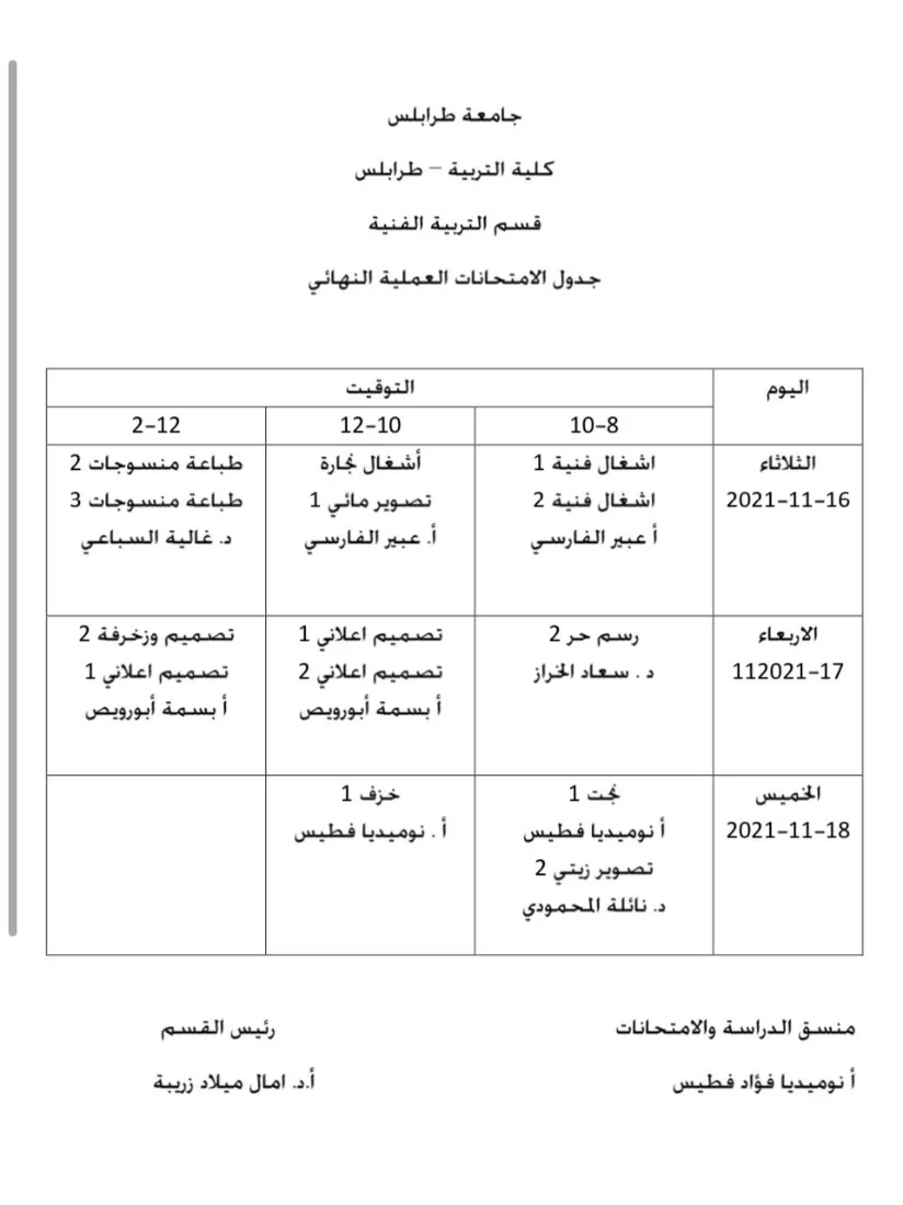 يعلن القسم عن بدء الامتحانات النهائية العملية يوم الثلاثاء من هذا الاسبوع ندعوا الله التوفيق والنجاح للجميع