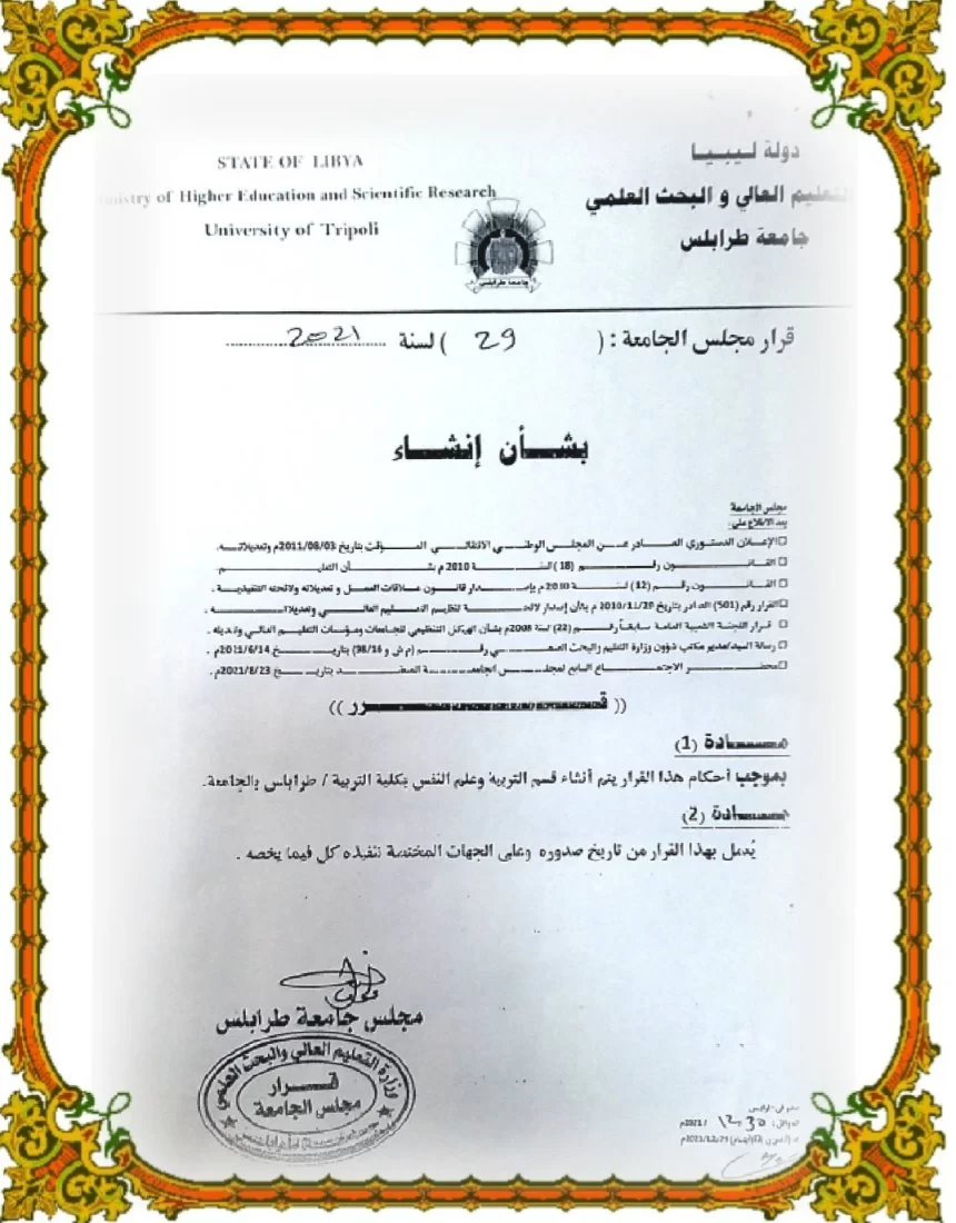 تهنئة بإنشاء قسم التربية وعلم النفس بكلية التربية/ طرابلس