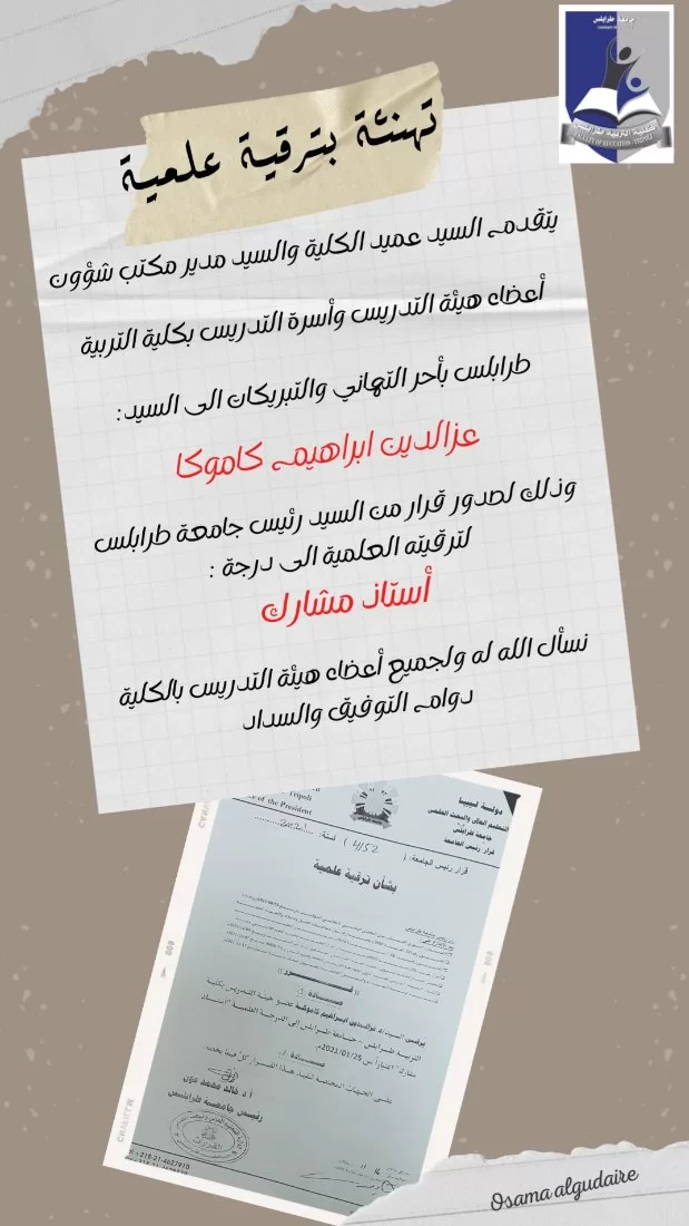 برز العديد من الباحثين المتميزين ذوي الكفاءات العالية في جميع التخصصات بكلية التربية/ طرابلس، وأفادوا ولازالوا يفيدون مجال البحث العلمي بنتاجهم العلمي من بحوث ومطبوعات علمية قيّمة. يستحقون التقدير والتكريم نظير مجهوداتهم ومساعيهم واليوم يحصدون ثمرة نتاجهم بالترقيات العلمية لمراتب أسمى