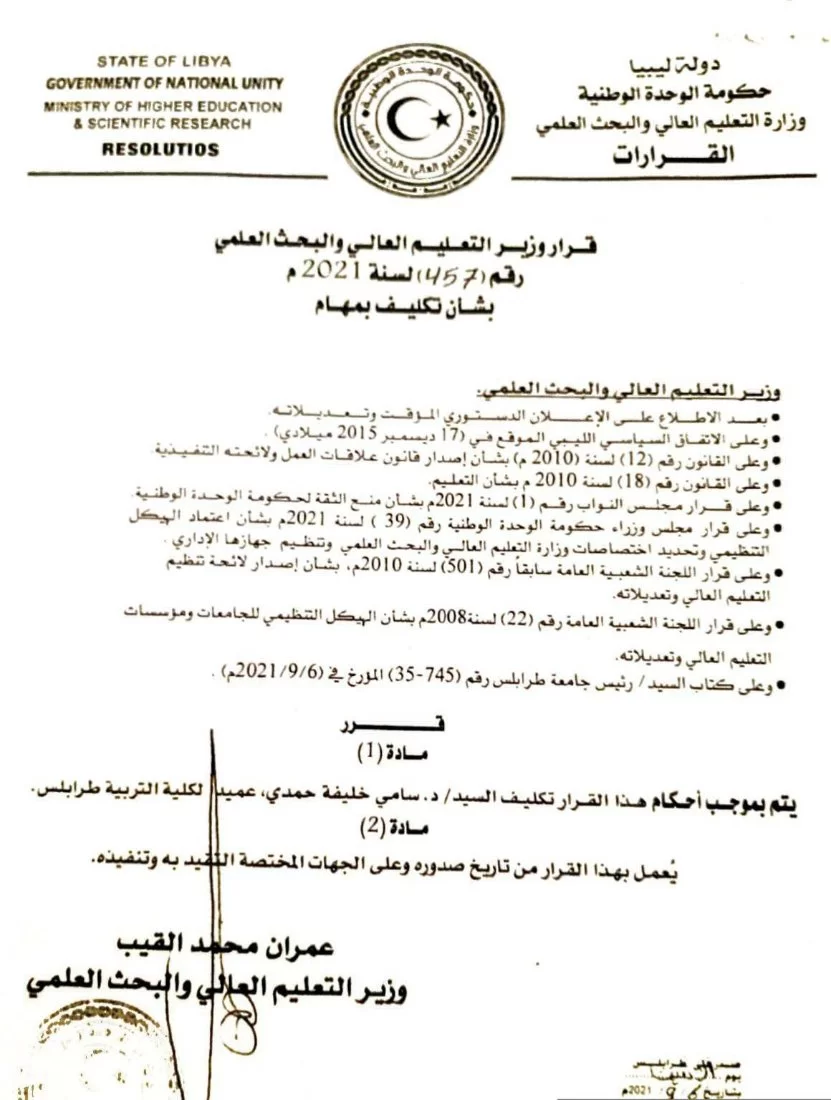 تسليم واستلام عمادة كلية التربية \ طرابلس