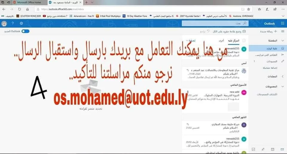 استخدام الايميل للمراسلة: عن طريق الكمبيوتر يمكنك باستخدام الكمبيوتر الدخول لموقع شركة Microsoft office واستخدام تطبيقات الموقع كما هو موضح بالصور المرفقة وذلك من خلال الرابط التالي: