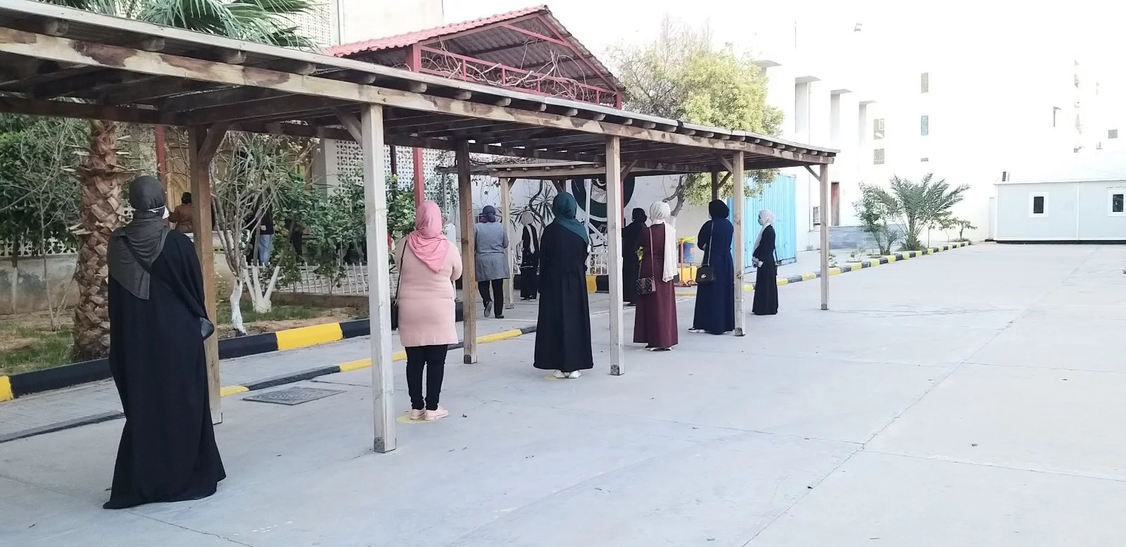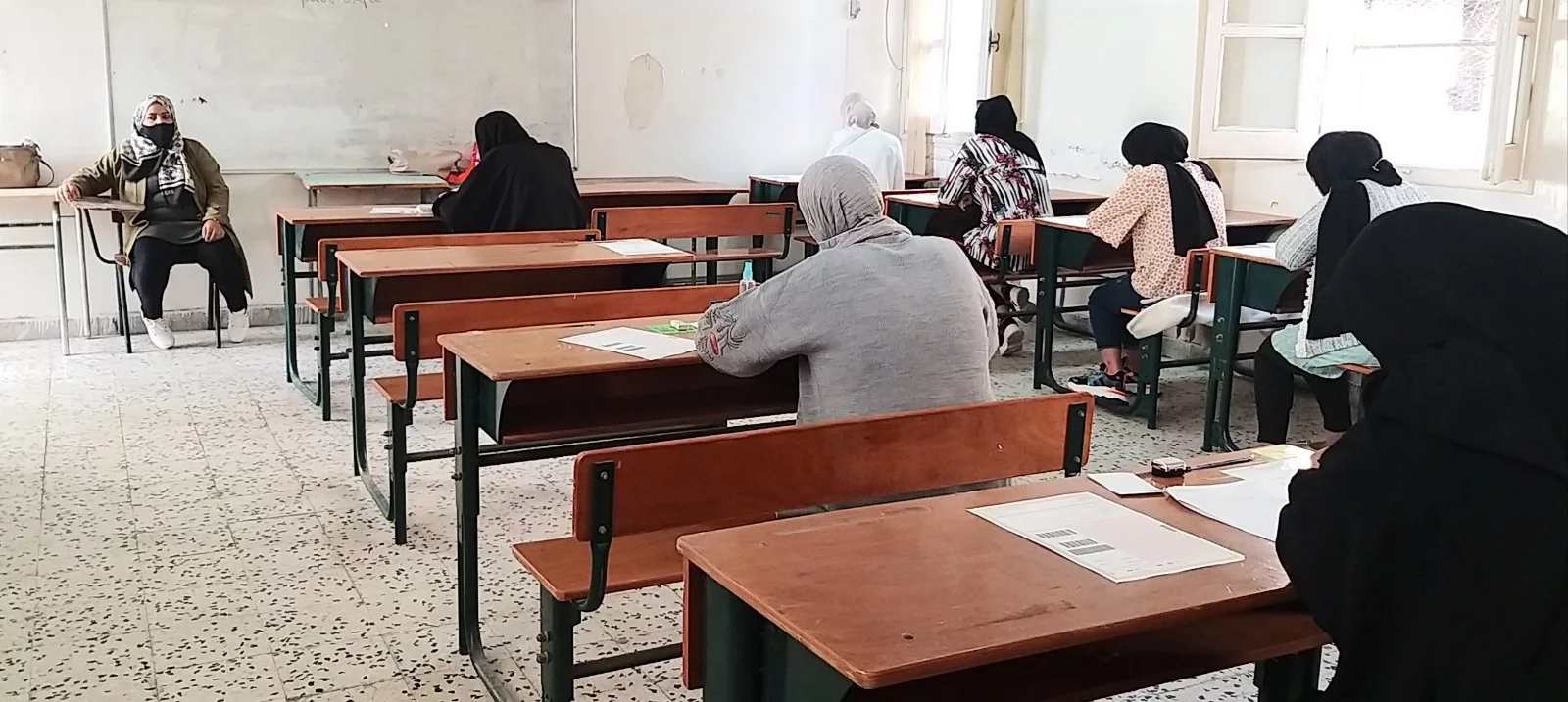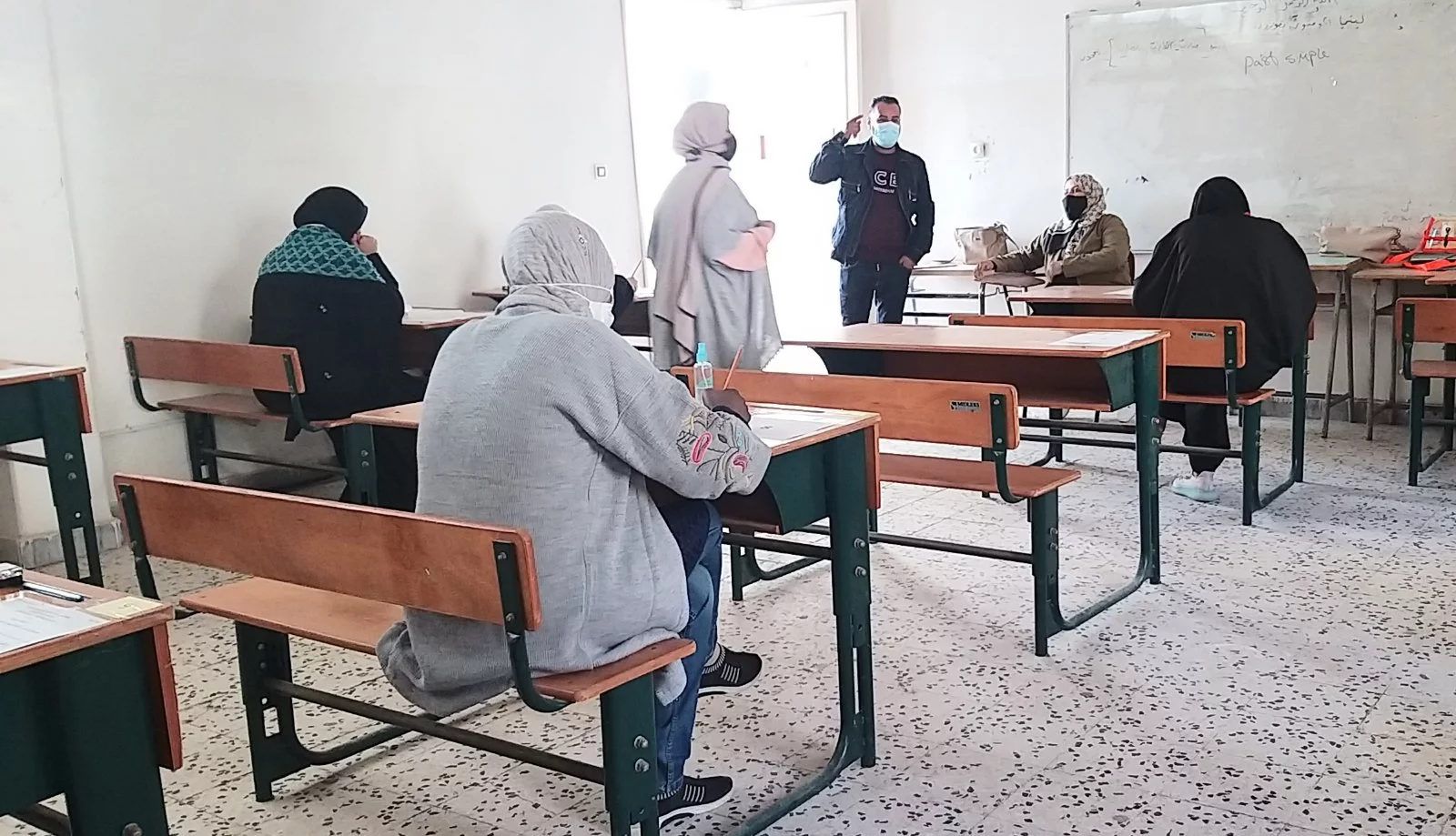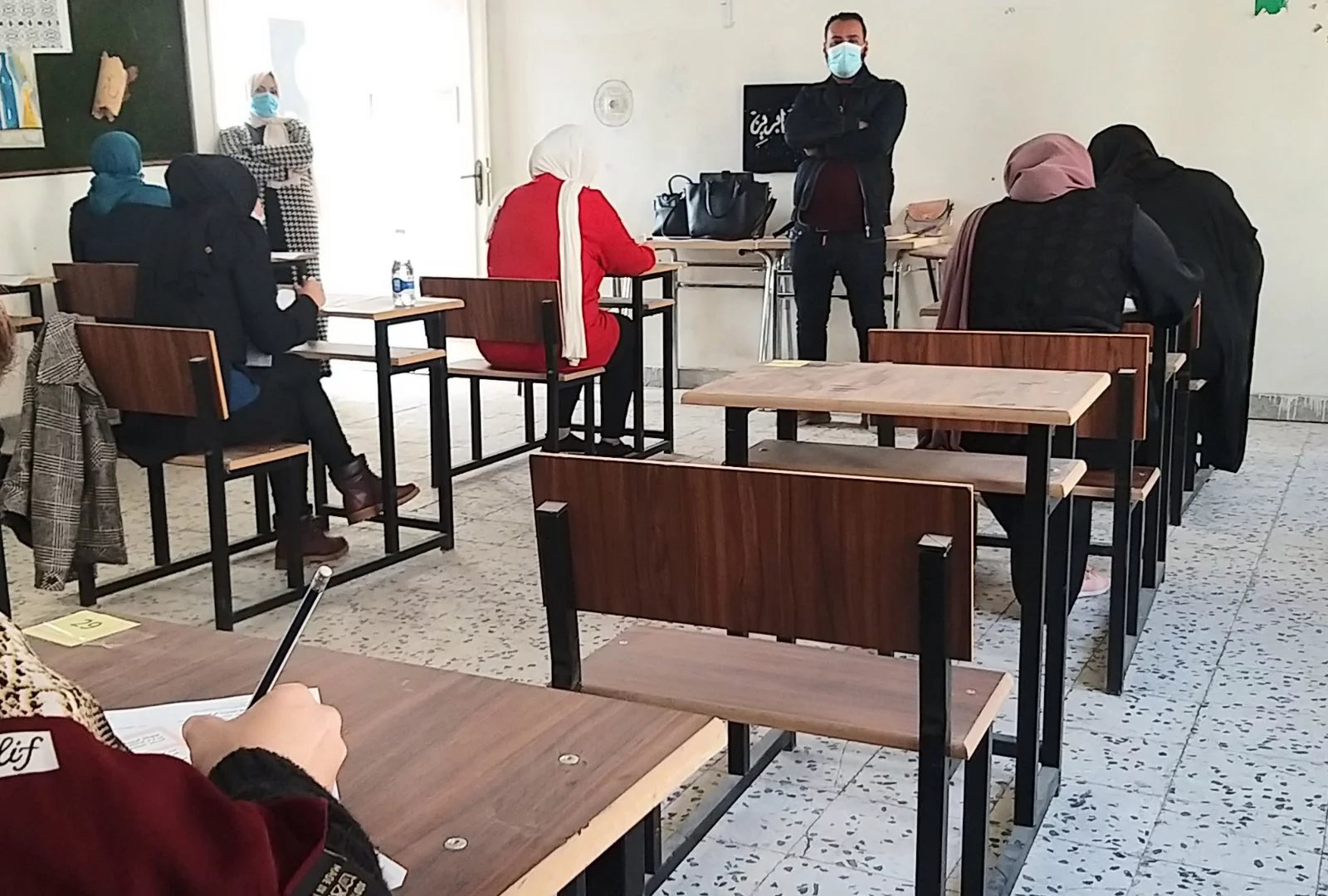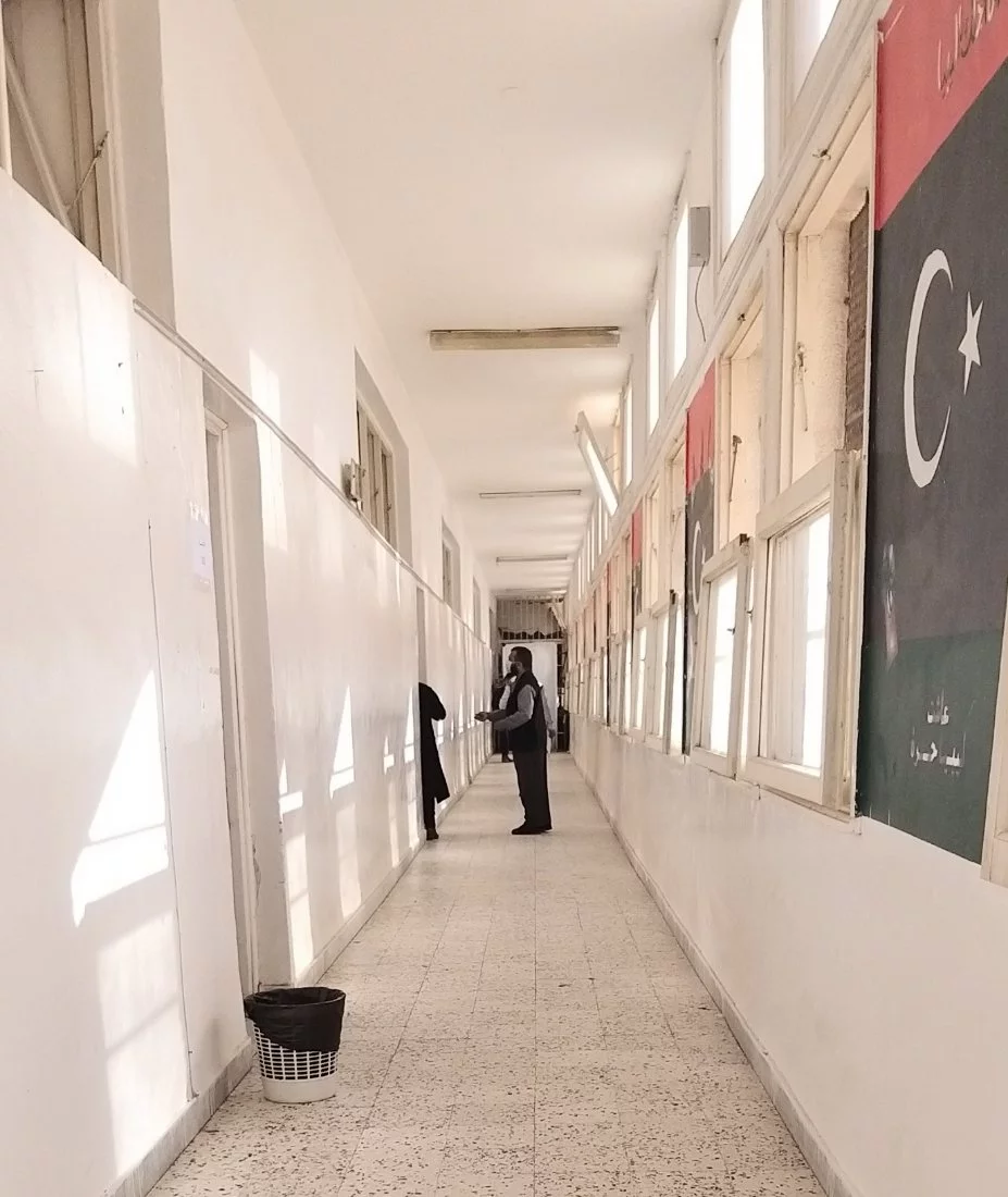 وقام بعملية الملاحظة داخل اللجان التي يبلغ عددها (7 لجان) لليوم الأول عدد من مراقبي بعض المدارس، كما أشرف الكادر الوظيفي أ. عبد العزيز سليمان، أ. عبد الفتاح ديهوم، أ. محمد آغا، مصطفى الغابر، وسام التومي واللجنة الصحية أ. زمزم شتيوي، وهدية دكام، وأفراد الحرس الأمني داخل الكلية، وبعض طلبة الاتحاد بالكلية على عملية تنظيم دخول الطالبات لمقار اللجان وفق شروط التباعد، وتم قياس درجة حرارة الطالبات وكل الملاحظين، وتعقيم الأيدي بدءا من دخولهم لمبنى الكلية.
