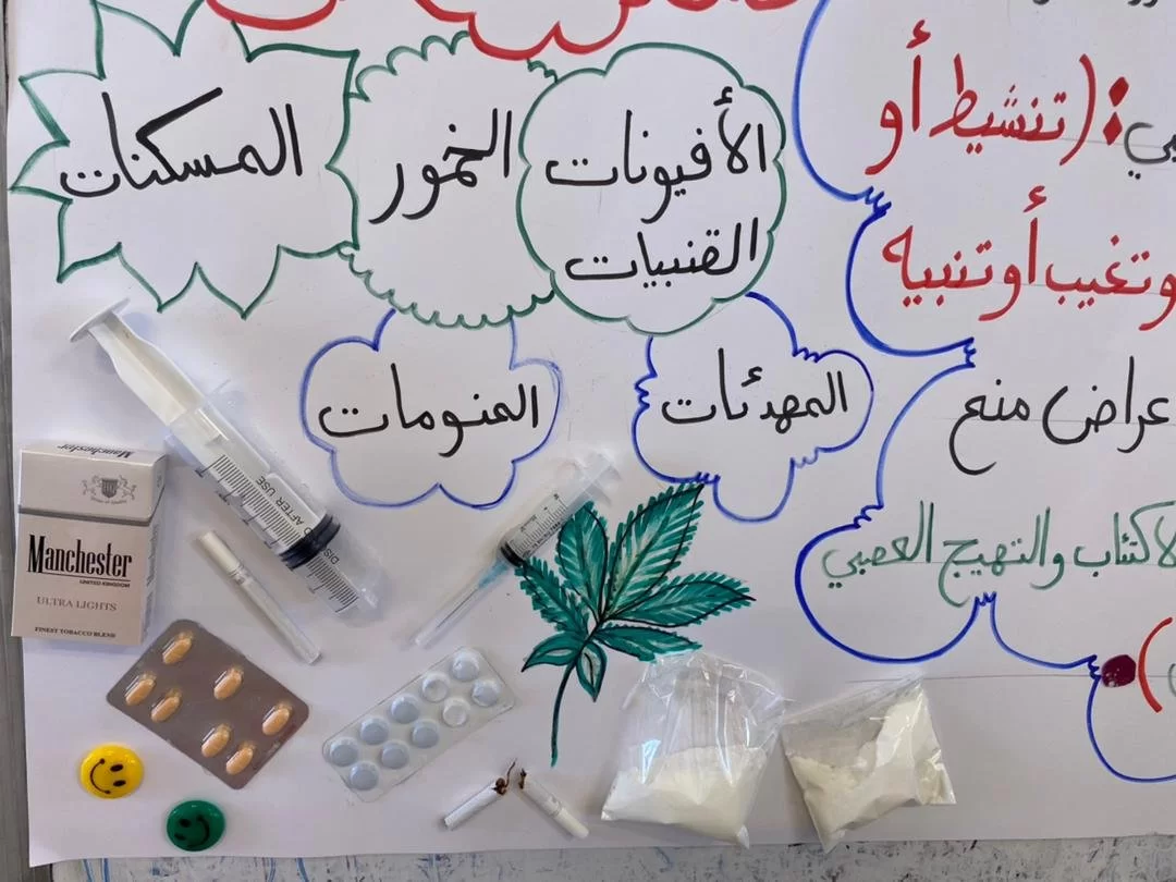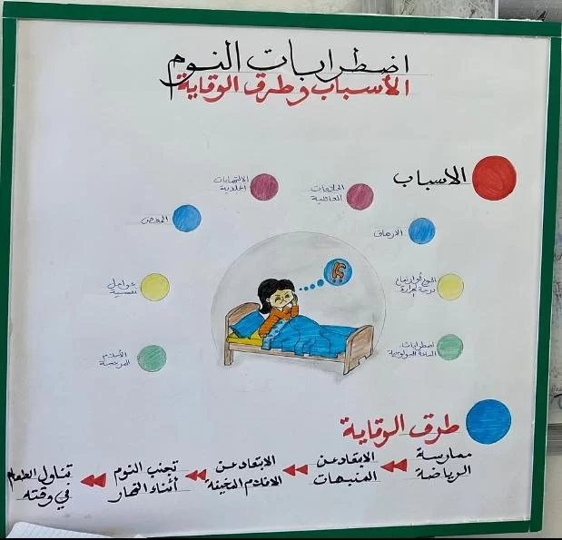وذكرت الدكتورة عفاف مهام وإسهامات طالباتها، حيث قامت كل من: ملاك دعوب (بإعداد وسيلة اضطرابات النوم)، وصفاء عبدالله الأمين (بإعداد وسيلة الإدمان)، كما قامت كل من الطالبات: أريج الصديق المنصور، وابتهاج عمارة، وابتهال عمارة،وندى شعبان، وإكرام عمارة، وخلود الرياني، وضحى جحيدر، بالقيام بالعرض التمثيلي المذكور أعلاه.