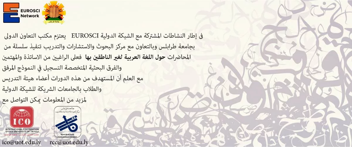 The University of Tripoli’s International Cooperation Office (ICO) and Research, Consulting and Training Center (RCTC) intend to start a series of training courses on Arabic language for non-native speakers of Arabic. Those courses are carried out within the framework of training activities that the University implements with EUROSCI. Students and faculty members of international universities that partner with the University of Tripoli are encouraged to join those training courses.