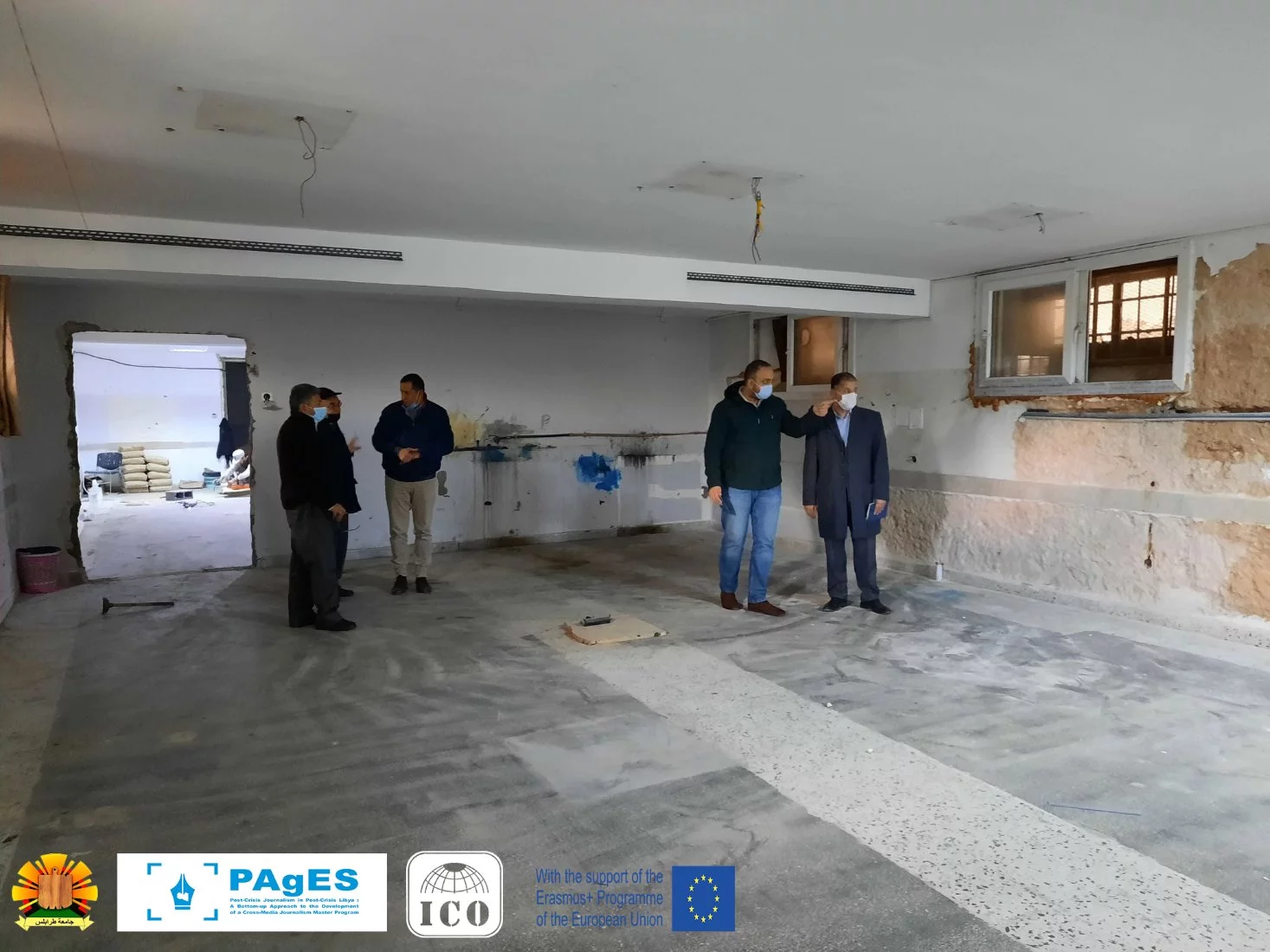 عقد صباح يوم الاحد الثالت عشر من ديسمبر 2020 م . بمبنى أدارة كلية الفنون والاعلام بجامعة طرابلس , أجتماعا تقابليا بين ادارة الكلية ومكتب التعاون الدولى بالجامعة. حضر الاجتماع السيد دكتور عميد الكلية و منسق المشروع بالكلية . أما من جانب مكتب التعاون الدولى فقد حضر السادة دكتور مدير المكتب و فريق عمل المكتب.تمحور الاجتماع للوقوف على أخر مستجدات تنفيد الصيانة اللازمة للمكان المخصص لانشاء معمل اعلامى متقدم والذى ياتى تجهيزه ضمن مشروع (PAgES) والذى يهدف لانشاء برنامج ماجستير متعدد الوسائط في الاعلام الممول من الاتحاد الاوروبي. وياتى ذلك فى اطار شراكة مع مجموعة من الجامعات المحلية والاوروبية.كما تم مناقشة الاستعدادات الاخيرة لبدء تسجيل الطلاب بالبرنامج حال استئناف الدراسة بالجامعة.