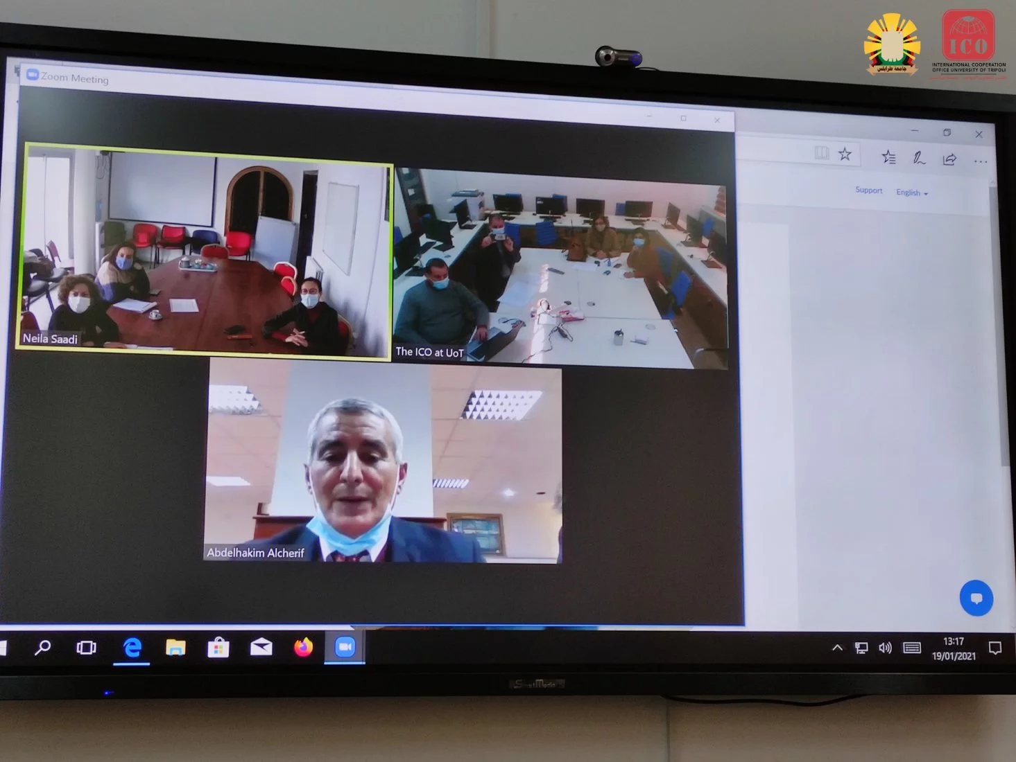 أفتتح الاجتماع السيدة د. وسيلة سعايدية مديرة معهد البحوث المغاربية بكلمة ترحيبة وقدم السيد د. عادل ضياف كلمة جامعة طرابلس نيابة عن أ.د نبيل النطاح رئيس جامعة طرابلس أكد فيها مضى الجامعة قدما في دعم برامج التعاون الدولى وفتح أفاق التعاون مع المؤسسات الدولية المناظرة .