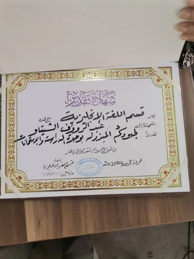 السبت 9 اكتوبر 2021 - في لفتة تقديرية متميزة وفريدة، قام رئيس قسم اللغة الإنجليزية بكلية اللغات الدكتور/حمزة الثلب رفقة الأستاد محمد عاشور رئيس وحدة الدراسة والامتحانات بالقسم بتكريم لفيف من أعضاء هيئة التدريس اللذين كانت لهم بصمة فاعلة وجهود مثمرة في سبيل جعل العملية التعليمية في القسم تسير على مسار التقدم والتطوير، متحديّن في ذلك كل العراقيل والصعوبات التي كانت تشكل تحدياً كبيراً للجميع، بدءاً بالحرب التي اجتاحت المنطقة ومروراً بجائحة كورونا وانتهاءً بالإعتصامات الإستحقاقية لأعضاء هيئة التدريس في التعليم العالي.