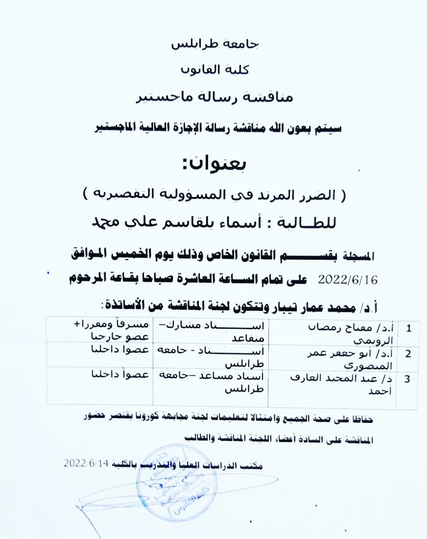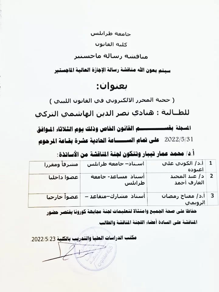 وبعد تقييم الرسالة من لجنة الحكم و المنهج العملي الذي اتبعه الطالب ،، قررت اللجنة قبول الرسالة و منحه درجة الماجستير في القانون الجنائي ..