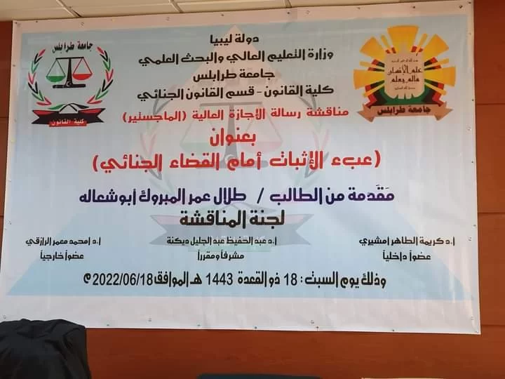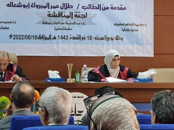 بالمبنى الإداري لكلية القانون عقدت صباح اليوم جلسة علنية لمناقشة رسالة الماجستير في  القانون الجنائي المقدمة من الطالب طلال عمر ابوشعالة، الموسومة : -
