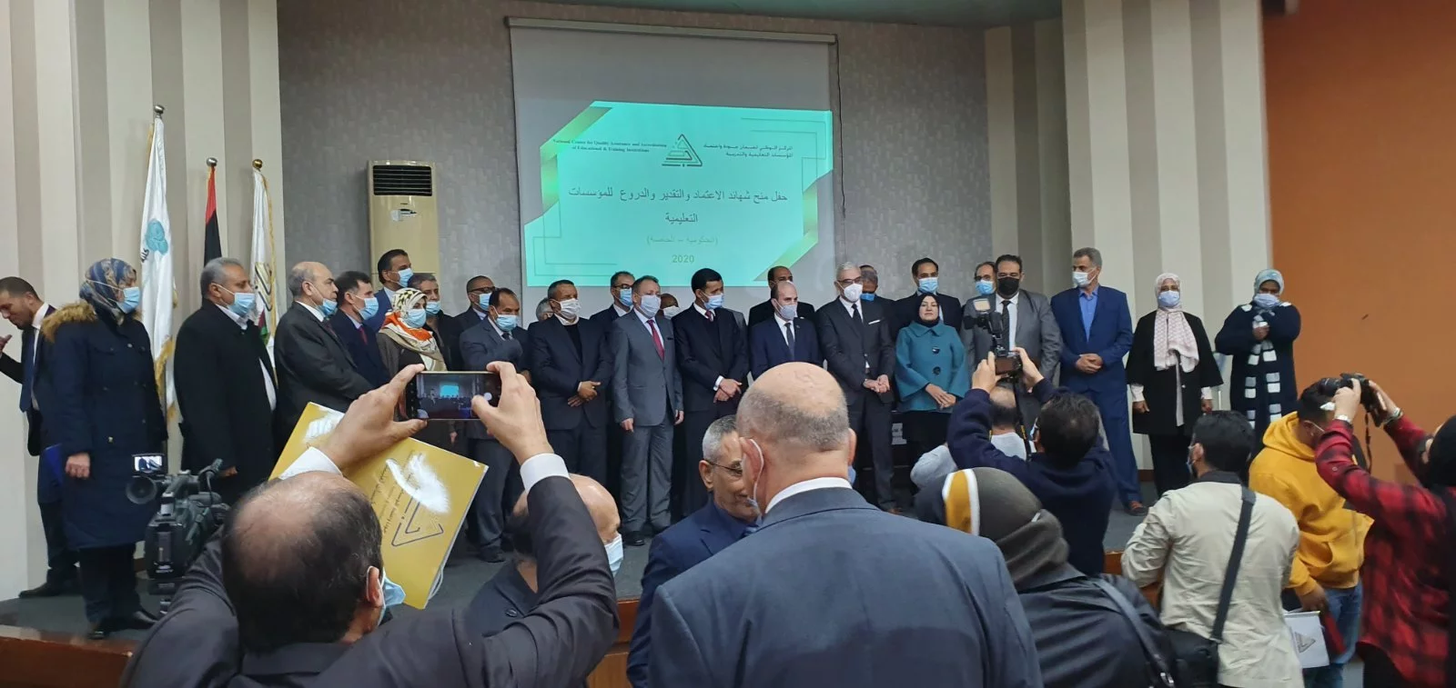 تم يوم الثلاثاء و بتاريخ 15 .12 .2020 و بحضور كل من السادة وزير التعليم ووكيله وعدد من المسؤلين ورؤساء الجامعات وعمداء الكليات تسليم شهائد و دروع الإعتماد للمؤسسات المعتمدة من قبل مركز ضمان الجودة. واشتملت المؤسسات التعليمية المعتمدة علي عدد ثلاث مدارس ثانوية بالإضافة لجامعتي سبها و مصراته بعدد اثنين من الكليات لكل منهما وجامعة طرابلس باعتماد كليتي الصيدلة والطب البشري. وقام بالاستلام عن كلية الصيدلة السيد وكيل الكلية مكلفا نيابة عن السيد عميد الكلية والسيدة رئيس قسم الجودة كما اشتمل الحضورعلي بعض الأعضاء من فريق مكتب ضمان الجودة بالكلية