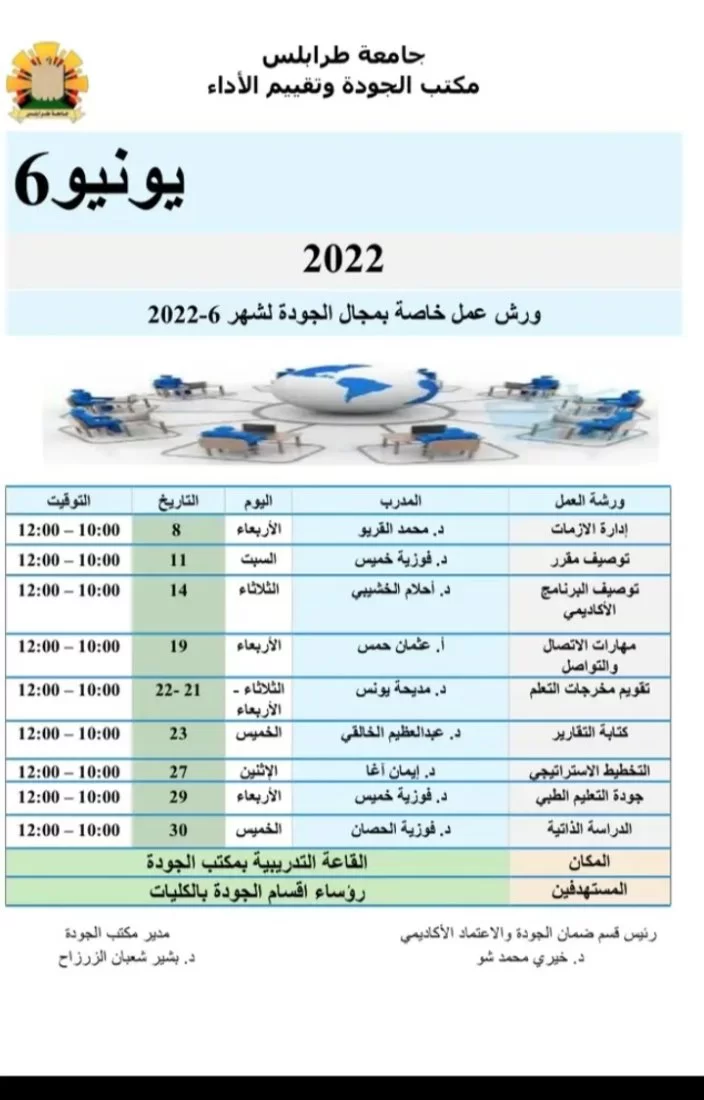 في ضوء و تأصيل مفهوم  الجودة والاعتماد المؤسسي والبرامجي  في كليات جامعة طرابلس يقيم مكتب الجودة وتقييم الاداء ورشة عمل حول الجودة والاعتماد  .وذلك وفق الجدول المرفق وللتسجيل التواصل مع الرابط الخاص .