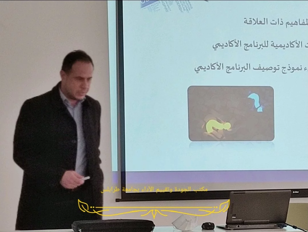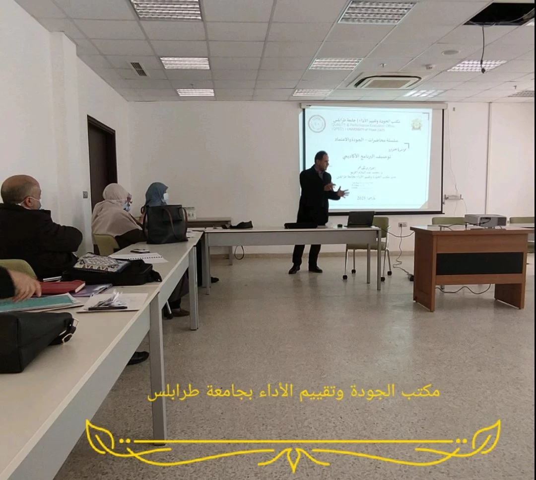 عُقدت يوم الأربعاء الموافق 17 مارس 2021م ورشة عمل بكلية الطب البشري بعنوان " المتطلبات البرنامج الأكاديمي: المفاهيم وآليات التطبيق" بالتنسيق بين مكتب الجودة وتقييم الأداء بجامعة طرابلس ومكتب الدراسات العليا والتدريب بكلية الطب البشري. وقام بإعداد وتنفيذ هذه الورشة "د. محمد عبدالسلام القريو" مدير مكتب الجودة وتقييم الأداء بجامعة طرابلس.
