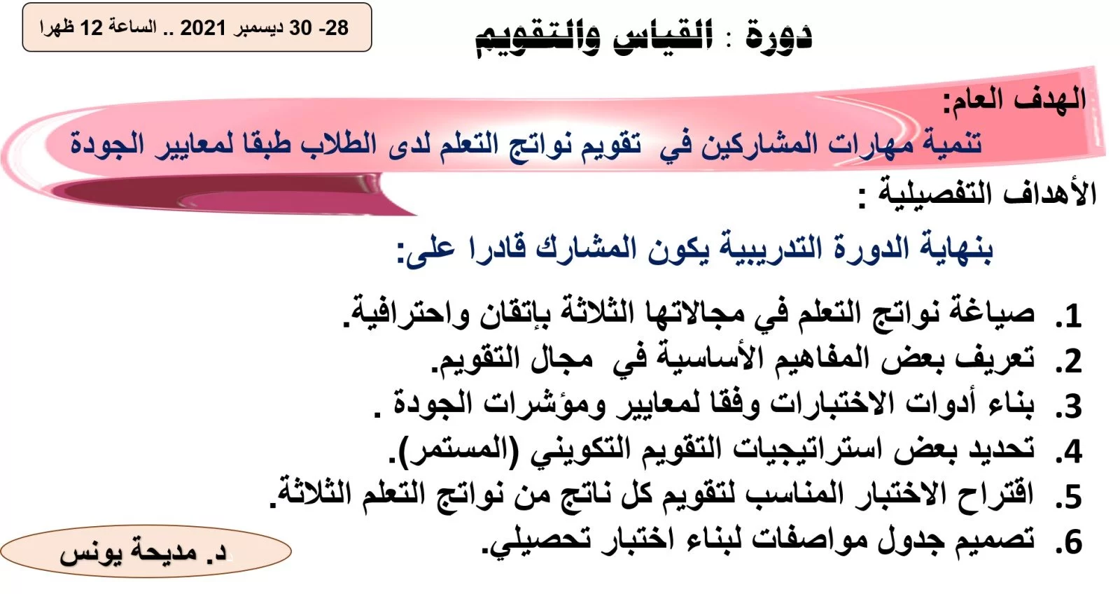 عنوان الدورة: مهارات التقويم والقياس. د. مديحة يونس توقيت الدورة28/12 12:00 - 15:00
