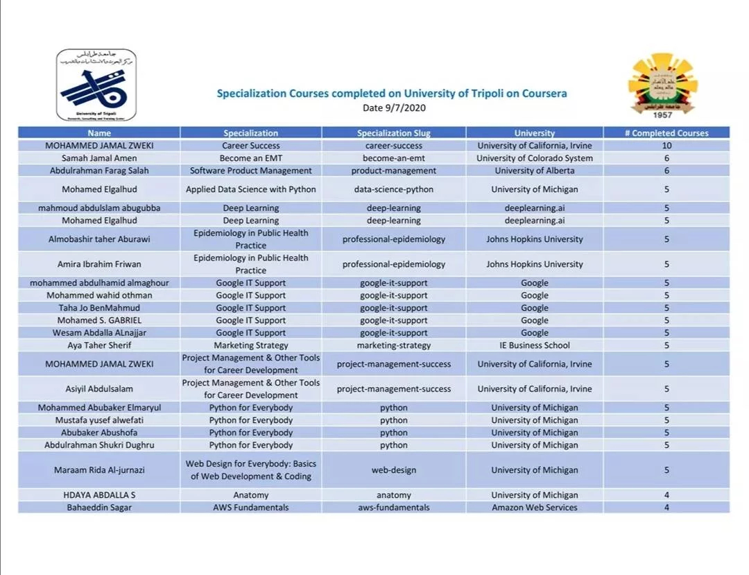 تكريم لبعض المشاركين فى المنصة التعليمية University of Tripoli on Couseraالسلام عليكم ورحمة الله وبركاتهيوجد داخل المنصة التعليمية University of Tripoli on Cousera عدد كبير من البرامج التخصصية، وهى عبارة عن برامج تدريبية واكاديمية فى تخصص محدد، قام عدد كبير من المشاركين فى المنصة بالتسجيل فى المقر