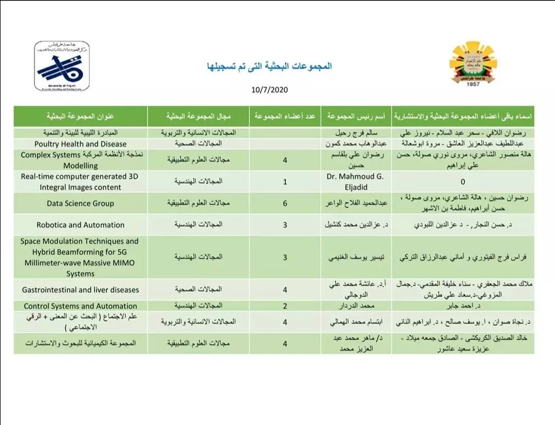 قائمة المجموعات البحثية السلام عليكم ورحمة الله وبركاتهتجدون ادناه قائمة المجموعات البحثية الموجودة فى قاعدة بيانات المركز، يعمل المركز على تفعيل وتشجيع تسجيل المجموعات البحثية بحيث تكون المجموعات البحثية قناة التواصل مع أعضاء هيئة التدريس فى كافة البرامج البحثية والتدريبية المختلفة التى يتم تنفيذها