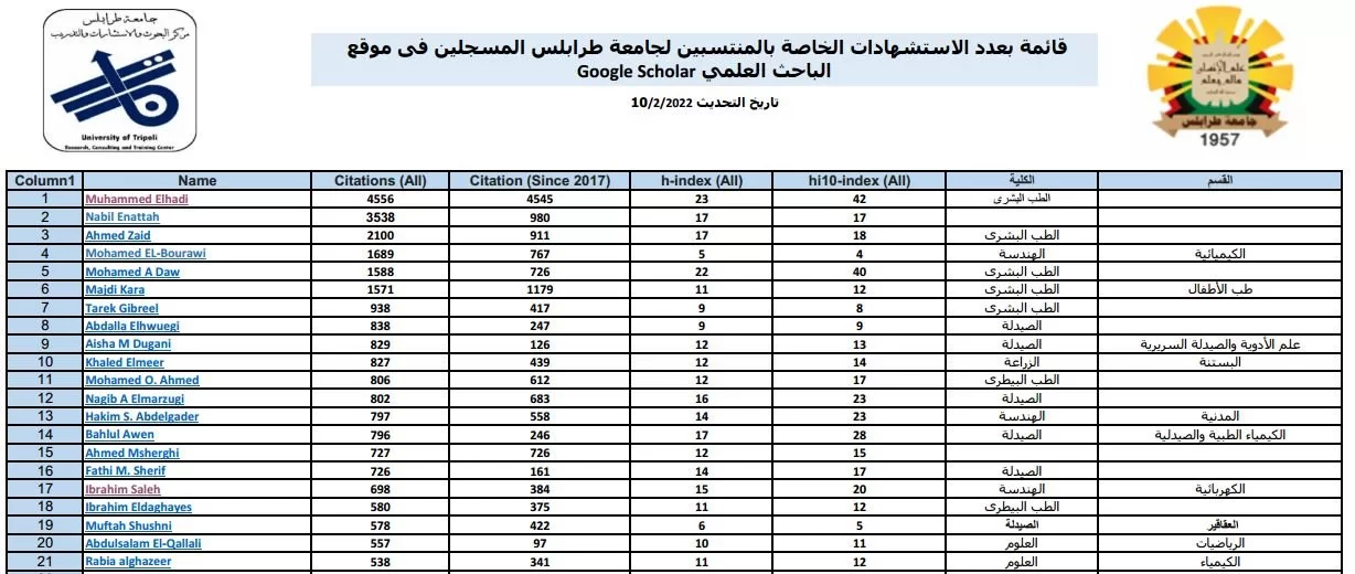 قائمة بعدد الاستشهادات الخاصة بالمنتسبين لجامعة طرابلس المسجلين فى موقع الباحث العلمي Google Scholar