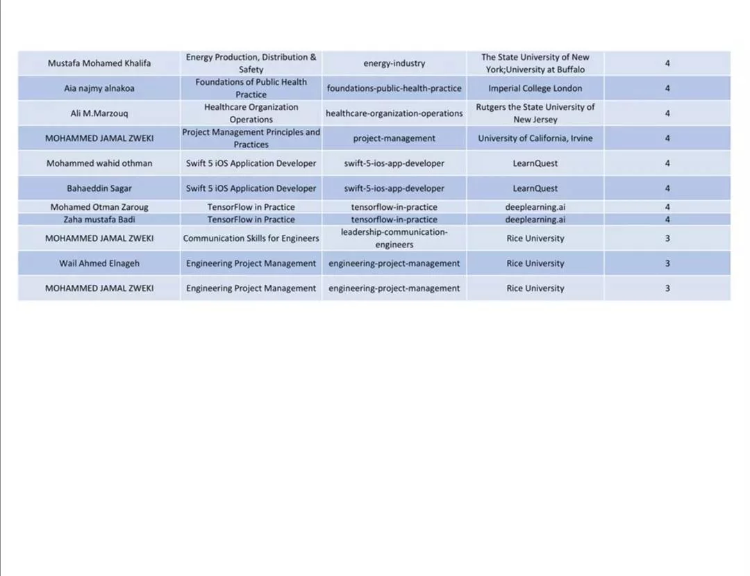 تكريم لبعض المشاركين فى المنصة التعليمية University of Tripoli on Couseraالسلام عليكم ورحمة الله وبركاتهيوجد داخل المنصة التعليمية University of Tripoli on Cousera عدد كبير من البرامج التخصصية، وهى عبارة عن برامج تدريبية واكاديمية فى تخصص محدد، قام عدد كبير من المشاركين فى المنصة بالتسجيل فى المقررات التخصصية، وهناك عدد كبير منهم قام باستكمال تلك المقررات. بإسم الجامعة والمركز نود ان نتقدم بخالص الشكر لكافة المشاركين الذين انهوا دراسة تلك المقررات التخصصية على الرغم من الظروف الغير طبيعية التى تمر بها بلادنا الحبيبه خلال هذه الفترة ونتمنى لهم دوام التوفيقمرفق قائمة المشاركين الذين انهوا دراسة البرامج التخصصية على المنصة العتليميةد. على أحمد قنونمدير عام المركز