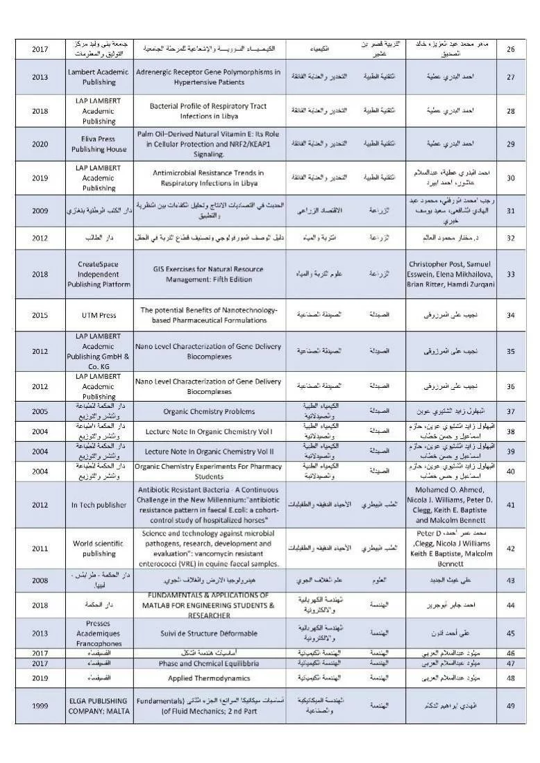 تجدون مرفقا قائمة الكتب المنشورة لأعضاء هيئة التدريس بجامعة طرابلس وذلك بحسب قاعدة بيانات جامعة طرابلس، فى حالة عدم وجود أى كتاب يرجى توثيق بيانات الكتاب فى قاعدة البيانات الموجودة بموقع المركز rcc.uot.edu.ly مع خالص التحية للجميع