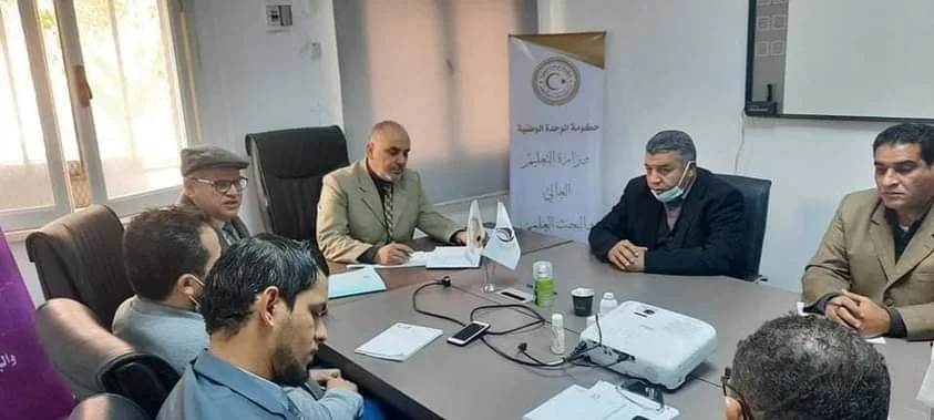 اليوم الاثنين الموافق 24_1_2022م، بمقر وزارة التعليم العالي، اجتمع معالي وزير التعليم العالي "أ. د. عمران القيب" بلجنة تفعيل دور المختبرات والمراكز البحثية بالجامعات الليبية برئاسة د. جمال اندير بحضور رئيس اللجنة العليا أ. د. رمضان الجدي و مدير ادارة التخطيط بالوزارة د. ايمن المحمودي، و مستشار الوزير أ. د. جمال الفردغ.