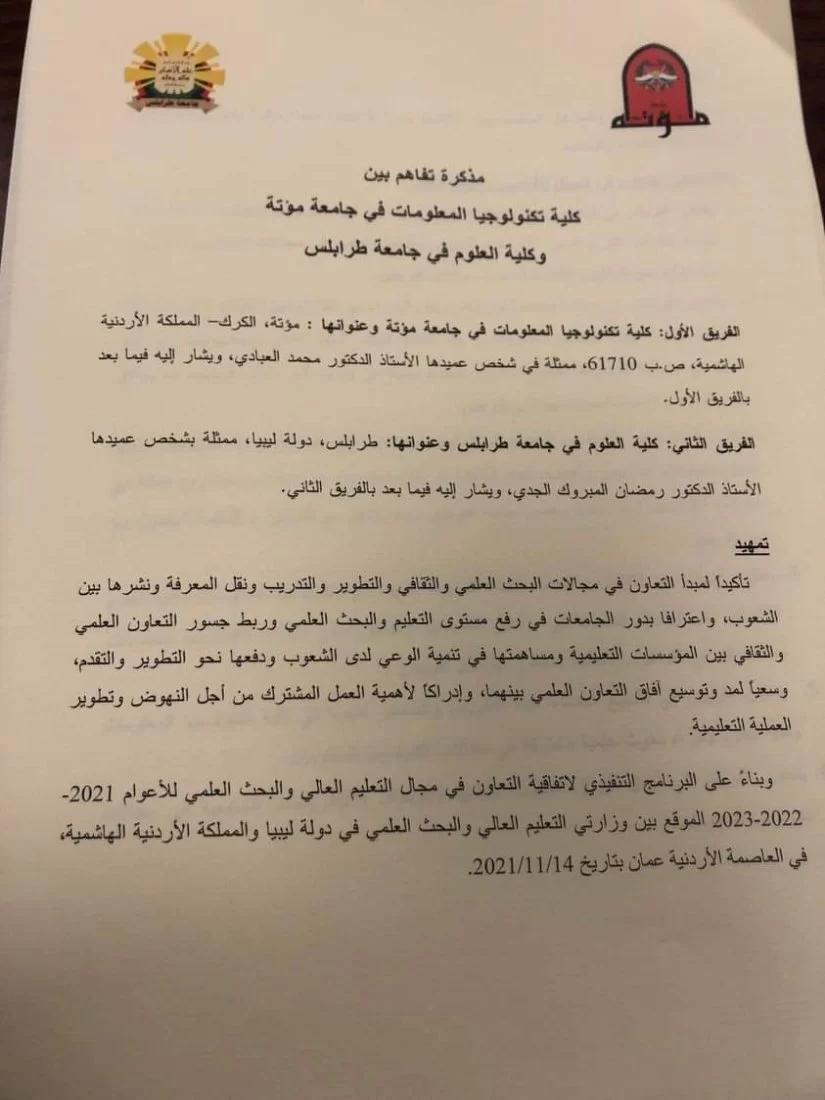 تم صباح اليوم الاثنين الموافق 28 مارس 2022 م توقيع مذكرة تفاهم بين كلية العلوم بجامعة طرابلس وكلية تكنولوجيا المعلومات بجامعة مؤته الاردنية وذلك للتعاون العلمي المشترك في كافة المجالات وقد وقعها عميدي الكليتين السيد ا.د.رمضان الجدي والسيد ا.د.محمد العبادي وقد كان التوقيع بصالة الاتحاد العام للجامعات العربية بعمان وبحضور الساده امين عام الاتحاد للجامعات العربية والمستشار الثقافي للسفارة الليبية بالاردن ورؤساء جامعة طرابلس وجامعة الزاوية والجامعة المفتوحة ومدير التعاون الدولي بجامعة المرقب ورئيس الجامعة الهاشمية ولفيف من رجال الاعلام والصحافة