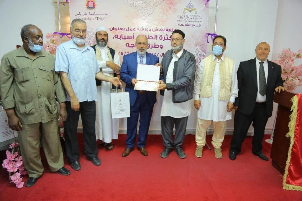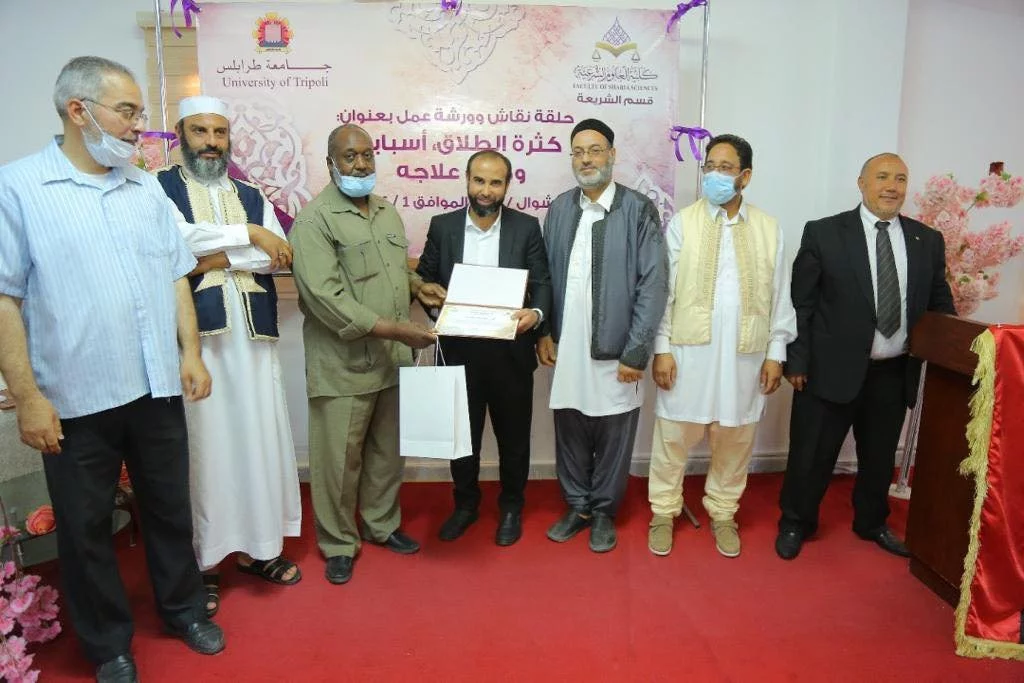 لما كانت كثرة الطلاق ظاهرة يئن منها المجتمع، وأثبتت الإحصاءات من داخل المحاكم ودار الإفتاء واستقراءات المصلحين والوعاظ والمأذونين تقرّ بانعكاساتها السلبية على أمن وسلامة واقتصاد المجتمع، وكانت سبباً جوهريا في تفكك منظومة الأسرة والانحراف وقطع الأواصر وتفشي الخلافات والضغائن؛ نظّمت كلية العلوم الشرعية بأشراف قسم الشريعة، بمسرح الكلية يوم الثلاثاء 18 شوال 1442 هجري، الموافق 1 يونيو 2021م على تمام الساعة العشرة صباحاً، ورشة عمل وحلقة نقاش خدمة للمجتمع وعوناً لصانعي القرار والمصلحين والحكماء والأخصائيين الاجتماعيين والتربويين للاستنارة بما تصل إليه من أسباب ونتائج وتوصيات وعوناً لهم على معرفة أغوار هذه القضية ووضع السبل الناجعة للقضاء عليها وعلاجها.وحضر الورشة كل من:1- مفتي طرابلس فضيلة الشيخ: أحمد ميلاد قدور.2- الشيخ علي التير مدير مركز الصفا للعلوم القرآنية.3- أ. ناجي الزواوي القاضي بالمحكمة العليا.4- د. أبوبكر أبوسوير عميد كلية جمعية الدعوة الإسلامية.5- أ. طلال الدريبي مدير إدارة مجلس البحوث والدراسات الشرعية بدار الإفتاء.6- د. صالح مصطفى المصراتي الاستشاري في طب الأطفال.بدأت الورشة بآيات بينات من الذكر الحكيم ثم كلمة ترحيبية للضيوف والحضور ثم عرض وثائقي حول الوقفة الاحتجاجية التي قامت بها الكلية بسبب العدوان على الأقصى الشريف وغزة.ثم استهل الدكتور النفاتي موسى بكلمة مقدمة عن فضل الزواج، وعن خطورة الطلاق وآثاره السلبية على المجتمع قدم عميد الكلية د. عبداللطيف العالم كلمته.فعاليات الورشة وحلقة النقاش بدأت بعرض أسباب الطلاق التي من أثر ما قبل عقد الزواج وأدار هذا الجانب د. الطاهر العياشي رئيس القسم، وتم فتح النقاش واستعراض احصائيات من المحاكم والاستفتاءات التي تصل لدار الإفتاء والمستشفيات.ثم أدار د. أحمد الحاسي الجانب الثاني وهو أسباب الطلاق التي بأثر ما بعد عقد الزواج، وشارك جميع الحضور في عرض الأسباب ووسائل المعالجة.وفي ختام الورشة تلا بعدها أ. علي عبدالرحمن مازن مقرر الورشة ماخلصت إليه من أسباب ونتائج وتوصيات.في الختام تم تكريم الضيوف والمشاركين والفاعلين في هذه الورشة.كما تم تكريم عضوي هيئة التدريس بقسم الشريعة الباحثين د. النفاتي موسى، وأ. علي مازن؛ لتأليفهما كتابين.وخلصت الورشة إلى أسباب كثرة الطلاق والنتائج والتوصيات الآتية:أولاً: الأسباب التي قبل عقد الزواج:1- اعتماد الفتاة على نفسها في اختيار الخاطب.2- إجبار الفتاة على زوج دون رضاها.3- عدم حسن الاختيار من كل طرف للآخر.4- عدم حصول الرؤية الشرعية بين الخاطب والمخطوبة.5- غياب الثقافة الصحيحة الشرعية بين المخطوبين حول سبل بناء وتعمير بيت الزوجية.6- عرض خصائص الفتاة ومواصفاتها عبر مواقع التعارف وعرض الزواج.7- عدم التوافق بين الخاطبين على الأمور الحياتية والمالية والاجتماعية.8- الوعود الوردية الحالمة غير الممكنة بين الخاطبين وخاصة من آثار الإعلام والمسلسلات والأفلام.9- طول فترة الخطوبة وعدم الصدق والصراحة بين الخاطبين في هذه الفترة.ثانياً: الأسباب التي بعد عقد الزواج:1- زواج الأقارب في بعض الحالات.2- تدخل الأهل في الشؤون الحياتية للزوجين.3- التغير المفاجئ في نمط الحياة.4- انعدام الثقة بين الزوجين.5- الغيرة وعدم الشعور بالأمان.6- العلاقة الحميمية " الجفاف العاطفي".7- الإسراف في التقنية الحديثة ووسائل التواصل الاجتماعي واستعماله بطرق غير مشروعة.8- خروج المرأة خارج البيت كثيراً.9- عدم الإنجاب أو تأخره أو إنجاب البنات.10- توارث الأمراض الوراثية في العائلة.11- الفارق الكبير في العمر، وعدم الكفاءة.12- الزواج بثانية مع عدم حصول توافق مع الزوجة الأولى.13- عدم التوافق في المستويات الفكرية والاقتصادية والاجتماعية والعلمية.14- عدم معرفة الحقوق والواجبات لدى الزوجين.15- عدم تبصرة الحكمين بالمعاني الشرعية.16- اللجوء إلى الحكماء والعلماء قبل اتخاذ قرار الطلاق.17- المعاشرة في غير مكان الحرث.18- إفشاء الأسرار وتصيد الأخطاء ونشرها.ث