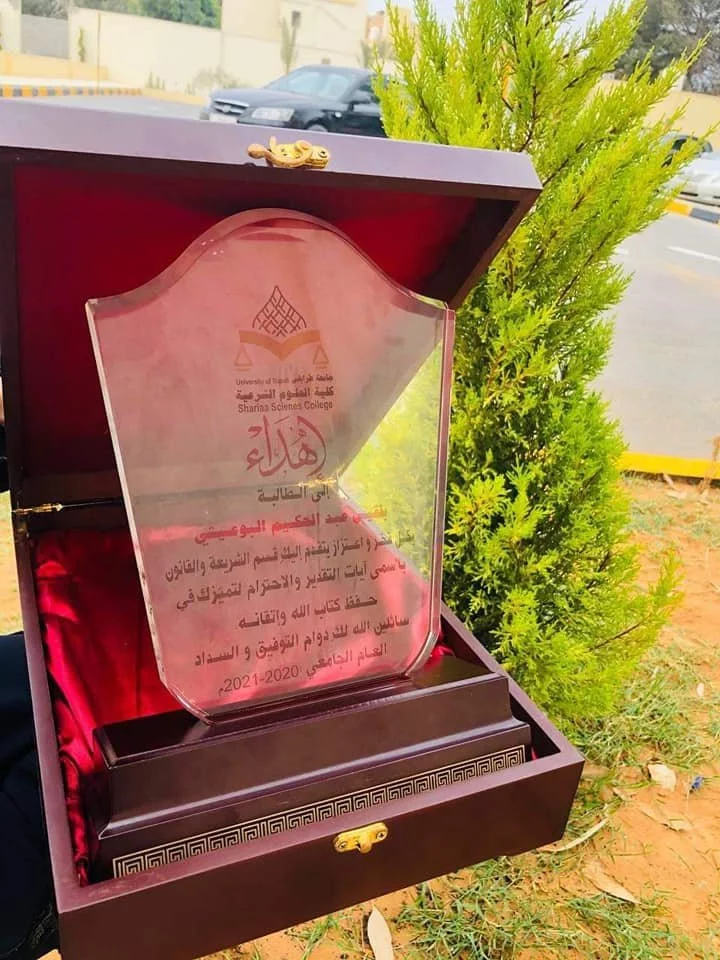 تكريم الطالبة بلقيس البوعيشي المقيدة بالسنة الأولى بقسم الشريعة والقانون بكلية العلوم الشرعية
