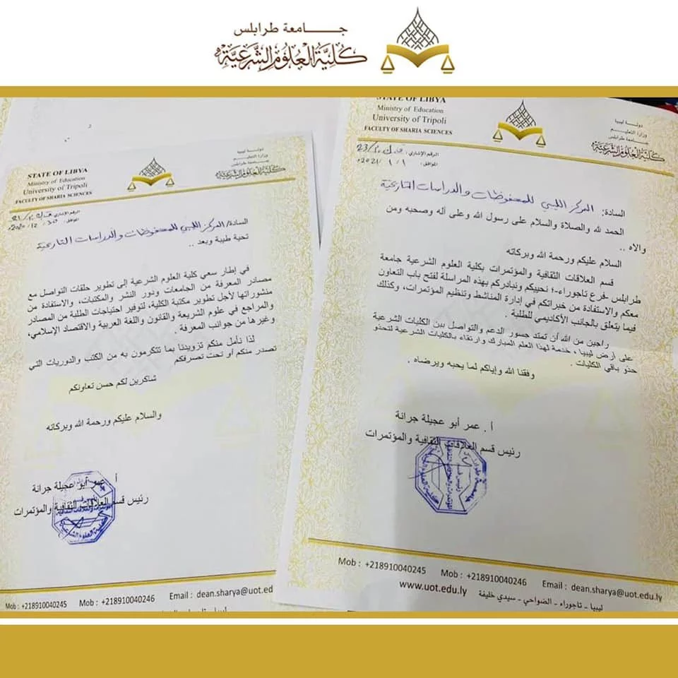 من أجلِّ ثمرات مشاركة الكلية في معرض الكتاب ظهور الروح الأخوية وإبداء روح التعاون بين الكليات الشرعية والمؤسسات والمراكز الثقافية أثناء فعاليات المعرض، الأمر الذي عمّق رغبتنا في توطيد هذه الروابط، وتقوية التعاون المشترك، حيث قام رئيس قسم المؤتمرات والعلاقات الثقافيى بمراسلة ولقاء عدد من هذه المؤسسات منها: جامعة مصراتة، وجامعة غريان، والمركز الليبي للمحفوظات، ومركز الشيخ علي الغرياني، ومؤسسة الشيخ الطاهر الزوي والهيئة العامة للثقافة، راجين بذلك مد جسور التواصل، وتبادل الخبرات، وإمدادنا بالمنشورات العلمية الصادرة من هذه المؤسسات..وفق الله الجميع لما فيه خير البلاد والعباد..