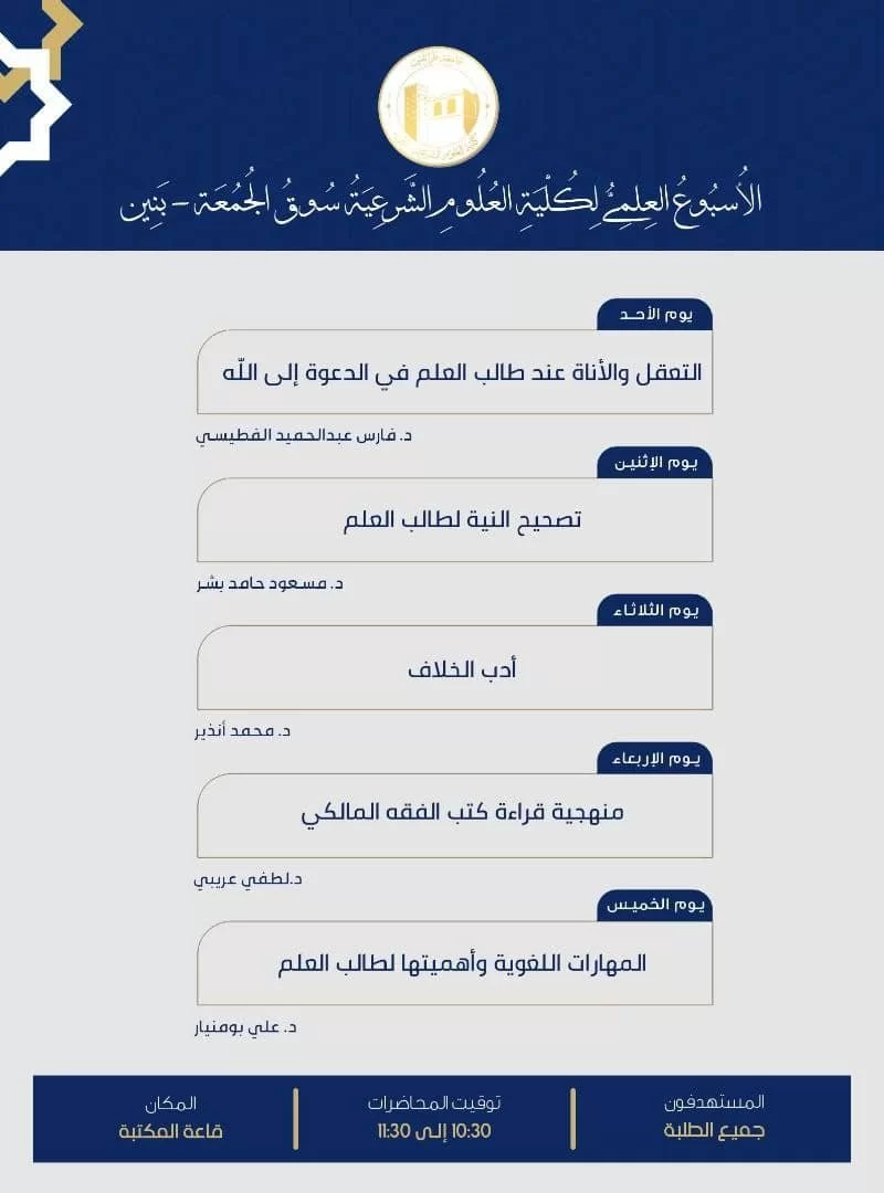 في إطار تحقيق أهداف الكلية في حماية المجتمع من الأفكار الهدامة، تعدّ كلية العلوم الشرعية سوق الجمعة المؤتمر الدولي الأول لنقد الإلحاد المعاصر والذي يشارك فيه نخبة من أهل العلم من داخل البلاد وخارجها.